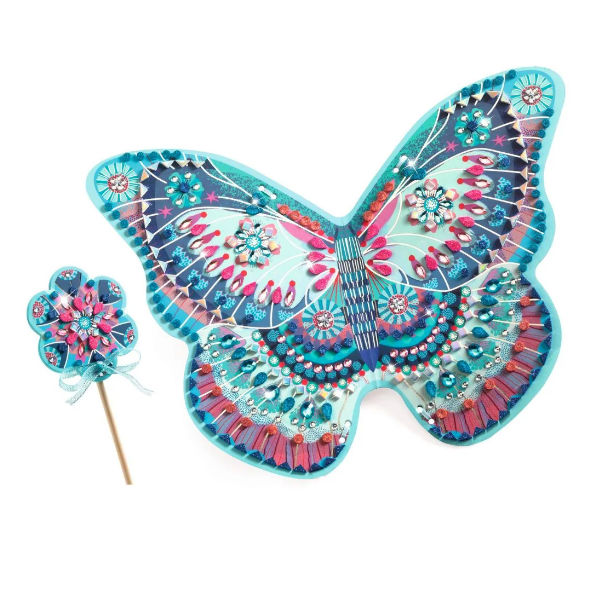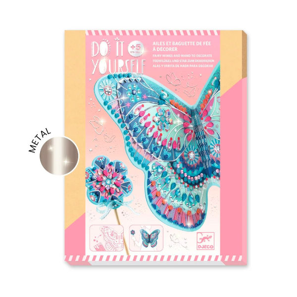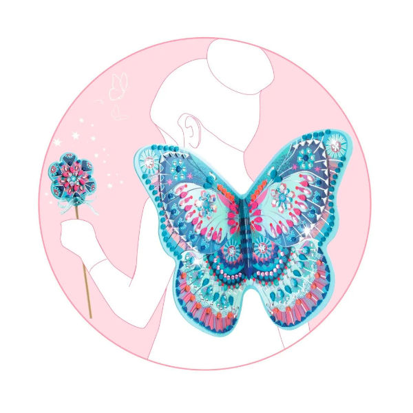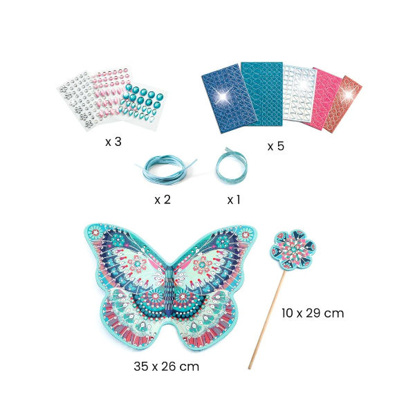 Een creatieve set bestaande uit een toverstaf en een paar feeënvleugels om te versieren. Het kind zoekt de nummers die op de accessoires gedrukt staan en plakt de glitter foamstickers en zelfklevende strassteentjes erop. Zodra de twee accessoires versierd zijn en glinsteren met meerdere reflecties, hoeven ze alleen nog maar in elkaar gezet te worden. Duik daarna in de droomwereld van feeën om de mooiste verhalen te verzinnen!