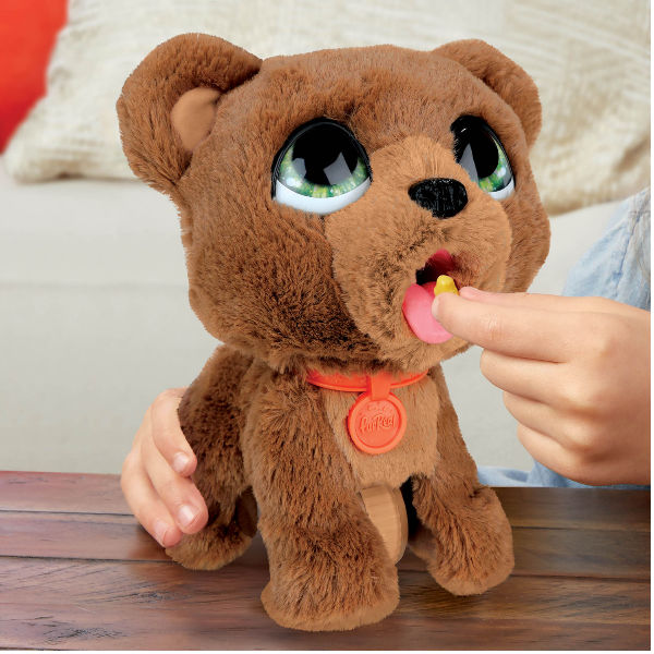 De schattige FurReal Poop-A-Lots Bear heeft een superzachte bruine vacht, sprankelende groene ogen en een oranje halsband. Deze beer is niet alleen schattig, maar ook klaar om met jou te spelen. Geef de 20 cm grote beer wat speelsnoepjes en dan is het tijd om te lopen, te poepen en te scheppen! Klik de meegeleverde riem op de halsband van je beer, geef hem een zetje en hij gaat met zijn springerige loopje mee voor een wandeling door het huis. Maar let op, hij heeft net gegeten en moet zomaar ineens ‘poepen’! Gebruik zijn poepschepje om de snoepjes te verzamelen en op te bergen/ Klaar voor de volgende wandeling! Na de wandeling kunnen kinderen de beer knuffelen, aaien en verzorgen.