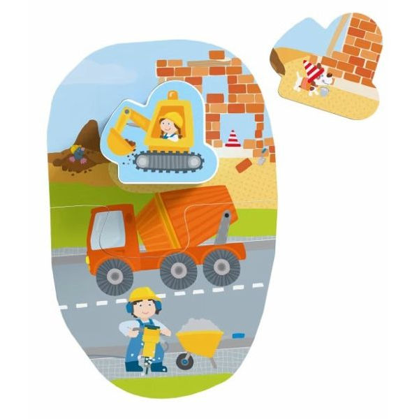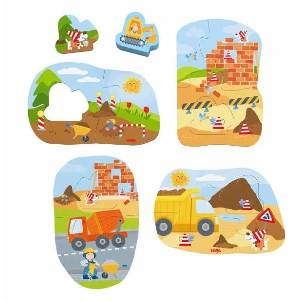 4 puzzels plus houten figuur “Bouwplaats” zijn de perfecte kennismaking met puzzelplezier voor kinderen vanaf 2 jaar. Het hondje “Sammy” bezoekt alle bouwplaatsen en zorgt zo voor veel plezier tijdens de eerste puzzel. De 4 motieven bevatten 2 of 3 kartonnen puzzelstukken van verschillende grootte, die mooi door kleine kinderhandjes kunnen worden vastgepakt. Het hoogtepunt: een magische, dubbelzijdig bedrukte houten figuur die in elke puzzelscène kan worden geïntegreerd! U kunt zelf bepalen wie er vandaag op de bouwplaats gaat graven: Max of Mia? Er zijn geen grenzen aan je fantasie! Op deze manier bevorderen de puzzels spelenderwijs de fijne motoriek van jonge puzzelfans.