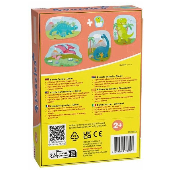 4 puzzels plus houten figuur “Dinos” zijn de perfecte kennismaking met puzzelplezier voor kinderen vanaf 2 jaar. Prachtig geïllustreerde dinosaurusmotieven zorgen voor veel plezier bij de eerste puzzel. De 4 motieven bevatten 2 of 3 kartonnen puzzelstukken van verschillende grootte, die mooi door kleine kinderhandjes kunnen worden vastgepakt. Het hoogtepunt: een magische, dubbelzijdig bedrukte houten figuur die in elke puzzelscène kan worden geïntegreerd! Zodra hij uit het ei komt, baant de kleine dinosaurus zich dapper een weg naar zijn vrienden. Er zijn geen grenzen aan je fantasie! Op deze manier bevorderen de puzzels spelenderwijs de fijne motoriek van kleine puzzelfans.