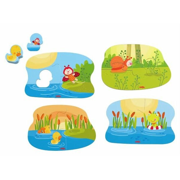 4 puzzels plus houten figuur “Dierenkinderen” zijn de perfecte kennismaking met puzzelplezier voor kinderen vanaf 2 jaar. Schattige dierenkindmotieven met eend, kikker, slak en lieveheersbeestje zorgen voor veel plezier bij de eerste puzzel. De 4 motieven bevatten 2 of 3 kartonnen puzzelstukken van verschillende grootte, die gemakkelijk door kleine kinderhandjes kunnen worden vastgepakt. Het hoogtepunt: een magische, dubbelzijdig bedrukte houten figuur die in elke puzzelscène kan worden geïntegreerd. Zwemt het eendje in het meer of rent het naar zijn vrienden? Er zijn geen grenzen aan je fantasie! Op deze manier bevorderen de puzzels spelenderwijs de fijne motoriek van kleine puzzelfans.