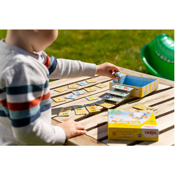 Pinguïn Piet wil in het zwembad plonsen. De spelers wijzen hem de weg door de symbolen op de omgekeerde kaartjes te onthouden. Als Piet het zwembad bereikt voordat het regent, hebben ze samen gewonnen.