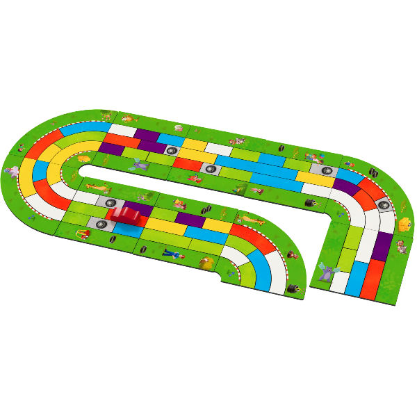 Inhoud: 6 racewagens, 6 kleurkubussen, 20 baandelen (10 bochten en 10 rechte stukken), 1 startveld, 1 doelveld, 49 kartonnen tegels.