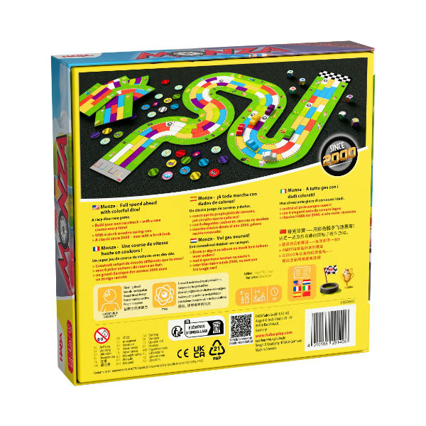 In Monza heb je naast een snelle raceauto ook uitgekiende tactieken en een beetje geluk nodig. De kleurdobbelstenen geven de velden van het circuit aan waar je naartoe kunt gaan. Welke rijstrook wordt genomen en wanneer wordt een inhaalmanoeuvre gestart? Wie als eerste over de finish komt, wint. Bouw je eigen racebaan – altijd nieuw!