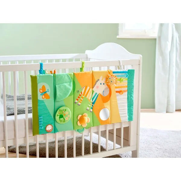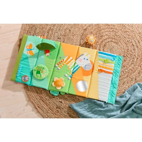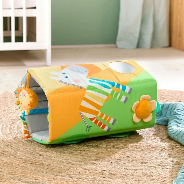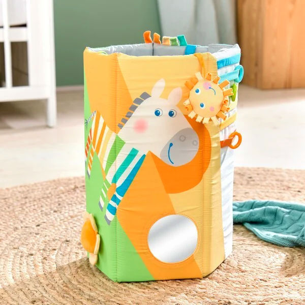 De Ontdekkingsrol Zebra is een echte vier-in-één alleskunner die kleintjes uitnodigt om te ontdekken, te bewegen en te spelen. Je kunt hem gebruiken als kruiprol om de eerste kruipbewegingen te ondersteunen, maar ook als koker wanneer je hem rechtop zet, als comfortabel speelkleed wanneer je hem uitrolt, en zelfs als speels element aan de babybox. Dankzij de vrolijke zebra-print, felle kleuren en speelse patronen is de rol onweerstaanbaar aantrekkelijk voor nieuwsgierige kleintjes. Overal zijn leuke details te vinden die uitnodigen tot grijpen, voelen en luisteren. Zo bevat de rol piepgeluidjes, knisperfolie, een klein spiegeltje, verschillende texturen en nog veel meer verrassingen om te ontdekken.
