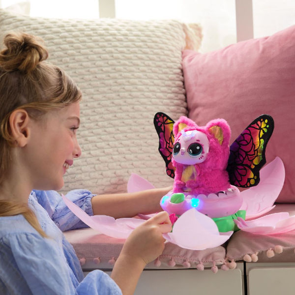 Plaats je Hatchipillar terug in de bloem en de bloemblaadjes sluiten. Geniet van de kleurrijke lichtjes en muziek totdat je fladderende vriend begint te bloeien. De bloemblaadjes openen zich weer en onthullen een getransformeerde Kittyfly met kleurrijke vleugels. Kietel haar, zing samen liedjes, voorspel de toekomst door Kittyfly vragen te stellen, en meer. Ontdek violet of rosie in elke Bloomables Kittyfly-bloem. Bevat 3 AA-batterijen.