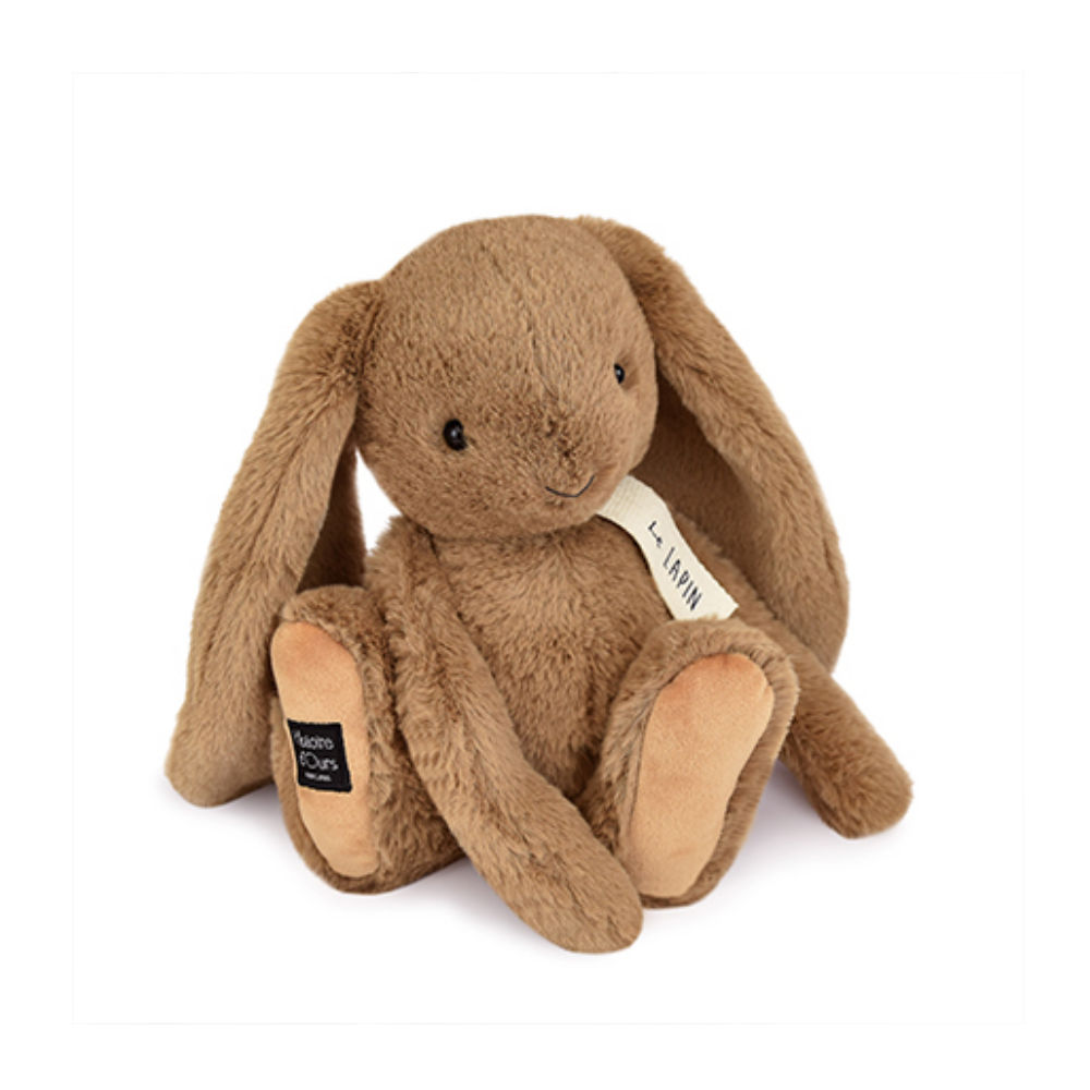 Een symbool van tederheid en onschuld… Het hazelnootbruine Konijn-knuffelspeeltje is meer dan dat! Een gezicht, zijdezacht haar, lange armen klaar om lange knuffels te verwelkomen. Grote oren om naar grote geheimen te luisteren en 32 cm pure liefde!
