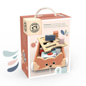 Inhoud: 5 houten stukken (1 wortel, 1 graszode, 1 vis, 1 stuk kaas, 1 bot), 5 dierenkaartjes (blauwe achterkant), 5 vormenkaartjes (gele achterkant), 5 kleurenkaartjes (rode achterkant), 1 handleiding.