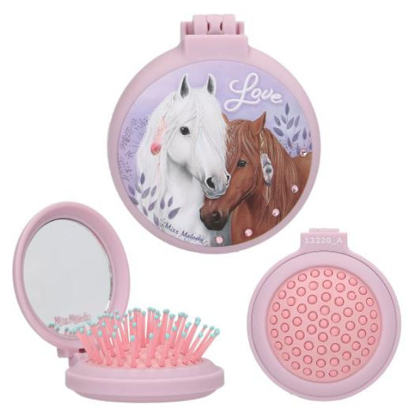 De ronde klapborstels van Miss Melody hebben aan de buitenkant mooie afbeeldingen van paarden die versierd zijn met glittersteentjes. Binnenin vind je een spiegel en de borstelharen die omhoog komen bij het open klappen. Verkrijgbaar in drie designs: roze, turquoise, paars.