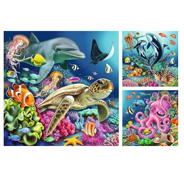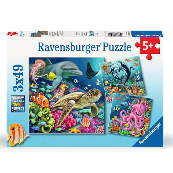 Onder Water 3x49p Ontdek de perfecte pasvorm! Ravensburger heeft voor ieder kind een perfecte puzzel. Met interessante motieven, strategische tegelgroottes en verschillende formaten is succes gegarandeerd voor alle leeftijden en moeilijkheidsgraden. Geniet van de kwaliteit van de Ravensburger met deze gezinsvriendelijke activiteit! Leeftijd 5+