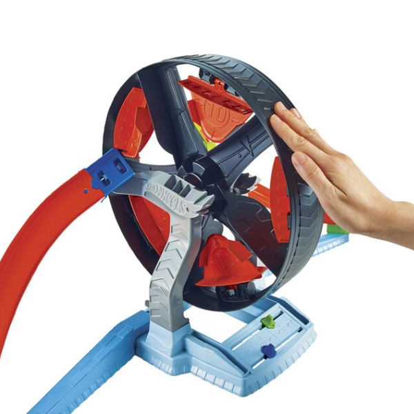 De Hot Wheels Action – Reuzenwiel Uitdaging Speelset bevat alles wat kinderen nodig hebben om allerlei stoere auto-stunts uit te voeren. Met het draaiende wiel, twee lanceerders en twee meegeleverde auto’s, kunnen kinderen zichzelf en elkaar uitdagen om hun auto’s te lanceren over de baan, door het draaiende wiel en vervolgens proberen de scorevlaggetjes op het wiel te raken voor punten! De speler met de meeste punten wint, maar de meeste pret zit hem natuurlijk in de uitdaging zelf. Helpt bij de ontwikkeling van motoriek, timing en wedstrijdmentaliteit! ​