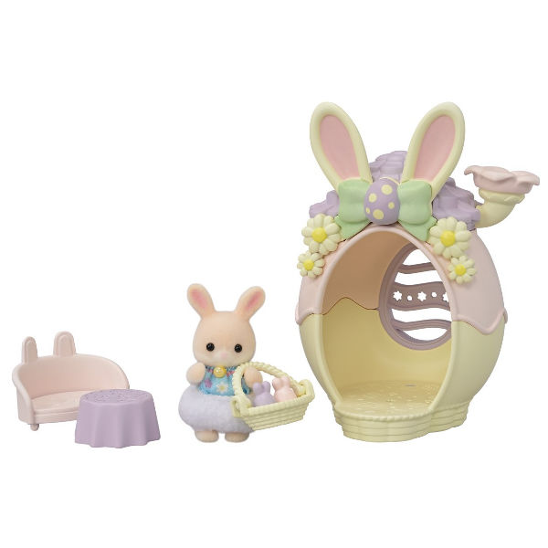 Een seizoensgebonden product. Deze set bevat de Marguerite Rabbit baby, accessoires en een klein huisje met een konijn- en paaseiermotief. Verstop de konijnvormige paaseieren op plekken zoals de schoorsteen en onder het tafelkleed voor een paaseierenzoektocht. Er zijn overal in huis en op meubels eiermotieven verborgen – kijk hoeveel je er kunt spotten! De Marguerite Rabbit-baby draagt een schattig paas-thema outfit