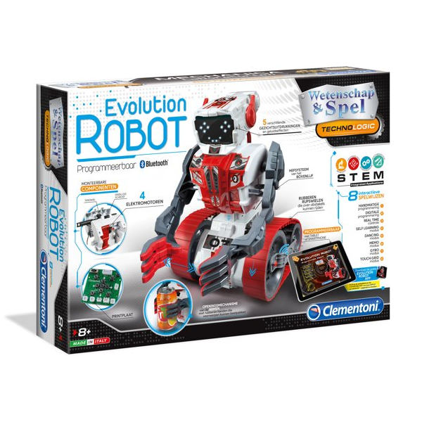 Met de Evolutierobot van Clementoni ontdek je op een leuke wijze de allernieuwste ontwikkelingen in de wereld van de robotica. Zodra de Clementoni robot gebouwd is, kan je hem programmeren om objecten op te pakken en te verplaatsen dankzij zijn bewegende armen, romp en rupsbanden.