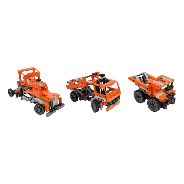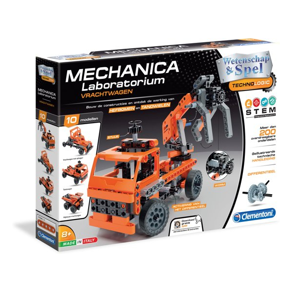 Een ongelofelijk nieuw laboratorium waarmee je ontdekt hoe grote vrachtwagens werken. Leer op een eenvoudige en zeer boeiende manier de basis van mechanica en techniek! Inclusief ruim 200 onderdelen, met een differentieel, tandwielen, stangen en panelen en nog veel meer, om 10 fantastische, bewegende modellen te bouwen: van vrachtwagens met een echt draaiend stuurwiel en een grijper voor boomstangen tot een kiepwagen, van mijnbouwtrucks tot een geweldig nieuw voertuig met een echt werkende kraan! De uitgebreide, geïllustreerde handleiding begeleidt het kind stap voor stap bij het bouwen van de modellen en leert het de beginselen van mechanica, techniek en de werking van hefbomen en tandwielen.