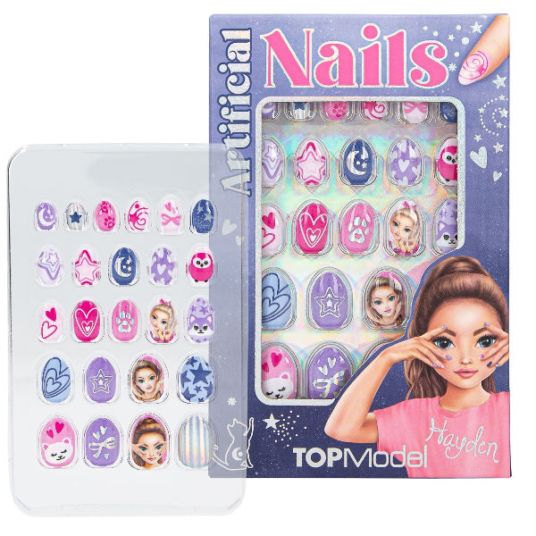 Voor trendy handen: de set bestaat uit 24 zelfplakkende kunstnagels van TOPModel zijn echt een blikvanger. De gekleurde nagels met mooie afbeeldingen zijn iets spits toelopend en glimmen in paarse en roze tinten. Gedeeltelijk zijn ze met glitter versierd. Handig: de nagels kunnen makkelijk met water verwijderd worden.