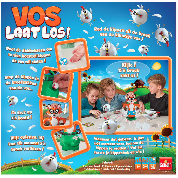 Maar pas op! Voor het einde van je beurt moet je op het hoofd van de vos drukken totdat je een klikgeluid hoort. Soms gebeurt er niets en is de volgende speler aan de beurt, maar op een onverwacht moment verliest de vos zijn broek en vliegen de kippen alle kanten op! Dan begint de echte chaos: alle spelers proberen zo snel mogelijk kippen te vangen en in hun eigen kippenhok te stoppen.