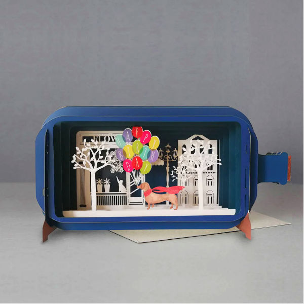 De kaart bestaat uit 6 lagen, uitgevouwen is het een kijkdoos in de vorm van een fles. Op de achterkant is ruimte voor eigen tekst.