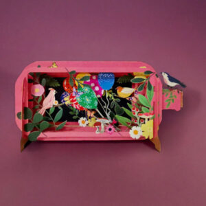 3D pop-up kaart van ca. 25 x 12,6 cm. Afmetingen geopend: 22 x 10 x 8 cm. Afmeting envelop: 24 x 12 cm.